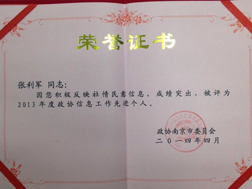 張利軍主任被評為2013年度政協(xié)信息工作先進個人