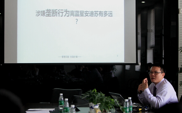 藍(lán)星安迪蘇營養(yǎng)集團(tuán)有限公司是全球領(lǐng)先的蛋氨酸生產(chǎn)企業(yè),2009年7月,在南京投資123,300萬元注冊成立藍(lán)星安迪蘇南京有限公司。面對復(fù)雜且日趨嚴(yán)峻的反壟斷態(tài)勢,亟需對公司高管進(jìn)行反壟斷專項法律知識指導(dǎo)。我所易波律師于2014年11月6日,應(yīng)邀對藍(lán)星安迪蘇南京有限公司高管進(jìn)行了專項知識授課。