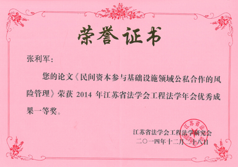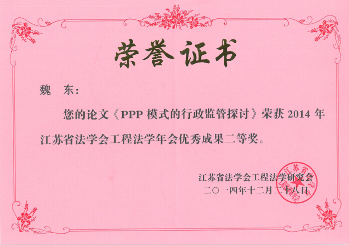 最后,江蘇省高級(jí)人民法院研究室副主任、省法學(xué)會(huì)工程法研究會(huì)副秘書長(zhǎng)沈明磊宣讀獲獎(jiǎng)優(yōu)秀論文名單。江蘇法德東恒律師事務(wù)所張利軍律師的論文《民間資本參與基礎(chǔ)設(shè)施領(lǐng)域公司合作的風(fēng)險(xiǎn)管理》、魏東律師的論文《ppp模式的行政監(jiān)管探討》榮獲2014年江蘇省法學(xué)會(huì)工程法學(xué)年會(huì)優(yōu)秀成果一、二等獎(jiǎng)。