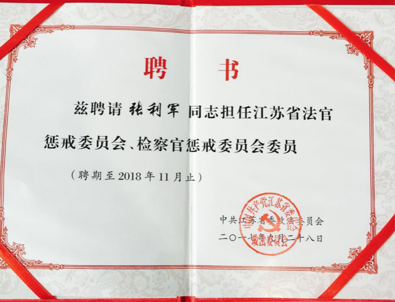 張利軍主任受聘擔(dān)任江蘇省法官懲戒委員會(huì)、檢察官懲戒委員會(huì)委員