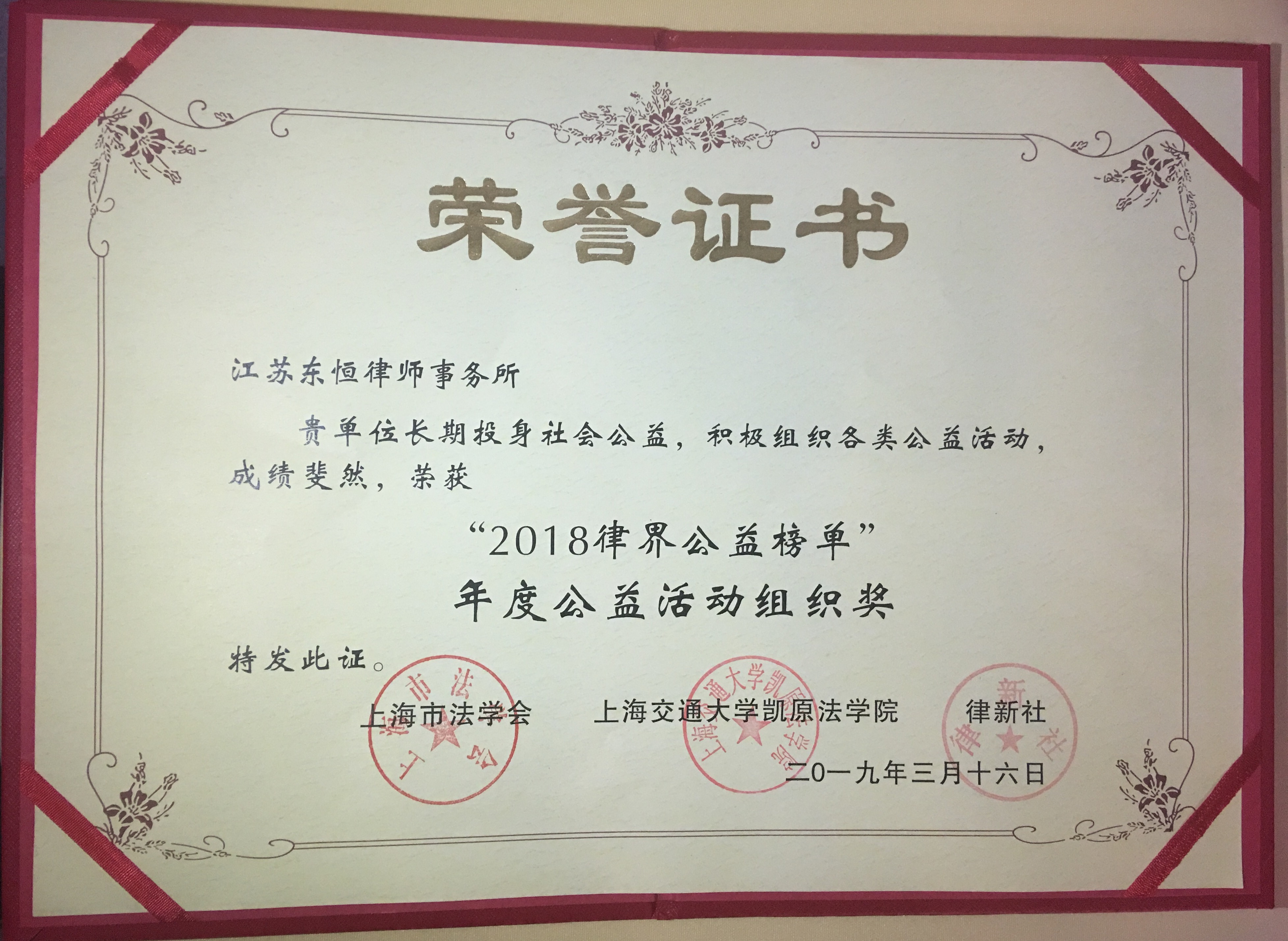 此次公益法律服務(wù)高峰論壇共有來自全國各地多個(gè)省市、律所、法律科技機(jī)構(gòu)等法律人報(bào)送的數(shù)百份公益故事參評(píng),經(jīng)線上征集、網(wǎng)絡(luò)投票和線下專家評(píng)審,法德東恒所榮獲“2018年度公益活動(dòng)組織獎(jiǎng)”,并由上海市法學(xué)會(huì)黨組副書記、專職副會(huì)長施偉東,上海交通大學(xué)凱原法學(xué)院黨委書記汪后繼頒獎(jiǎng)。
