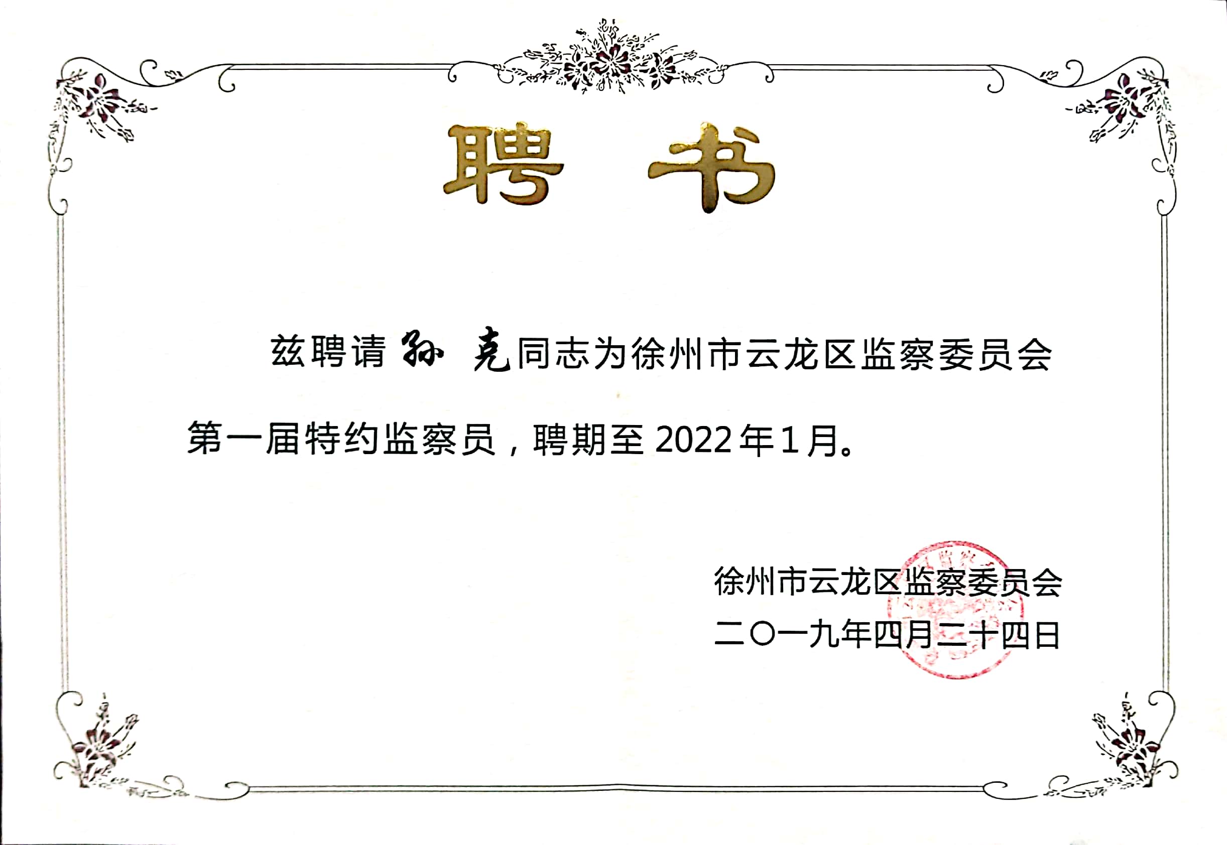 為深化國家監(jiān)察體制改革,充分發(fā)揮紀委監(jiān)委合署辦公優(yōu)勢,推動監(jiān)察機關依法接受民主監(jiān)督、社會監(jiān)督、輿論監(jiān)督,根據(jù)《中華人民共和國監(jiān)察法》和《徐州市云龍區(qū)監(jiān)察委員會特約監(jiān)察員工作辦法(試行)》等有關規(guī)定,徐州市云龍區(qū)監(jiān)察委員會經(jīng)過嚴格審查、反復篩選、慎重考慮,擇優(yōu)聘任了云龍區(qū)監(jiān)察委員會第一屆特約監(jiān)察員,江蘇法德東恒(徐州)律師事務所主任孫克榮列其中。