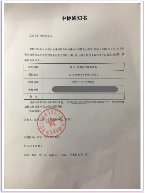 當(dāng)前,軍隊和武警部隊全面停止有償服務(wù)是一項重大政治任務(wù),對于實現(xiàn)黨在新形勢下的強(qiáng)軍目標(biāo)、保持軍隊性質(zhì)和本色、純潔部隊風(fēng)氣具有十分重要而深遠(yuǎn)的意義。為積極穩(wěn)妥推進(jìn)停止有償服務(wù)工作,中國人民解放軍陸軍工程大學(xué)針對軍隊善后工作等法律服務(wù)展開對外采購招標(biāo)。江蘇法德東恒律師事務(wù)所憑借系統(tǒng)性、針對性、全方位的法律服務(wù)產(chǎn)品,以及成熟的專業(yè)化法律服務(wù)團(tuán)隊,經(jīng)過層層選拔和嚴(yán)格評審,在12家競標(biāo)人中脫穎而出,成功中標(biāo)。