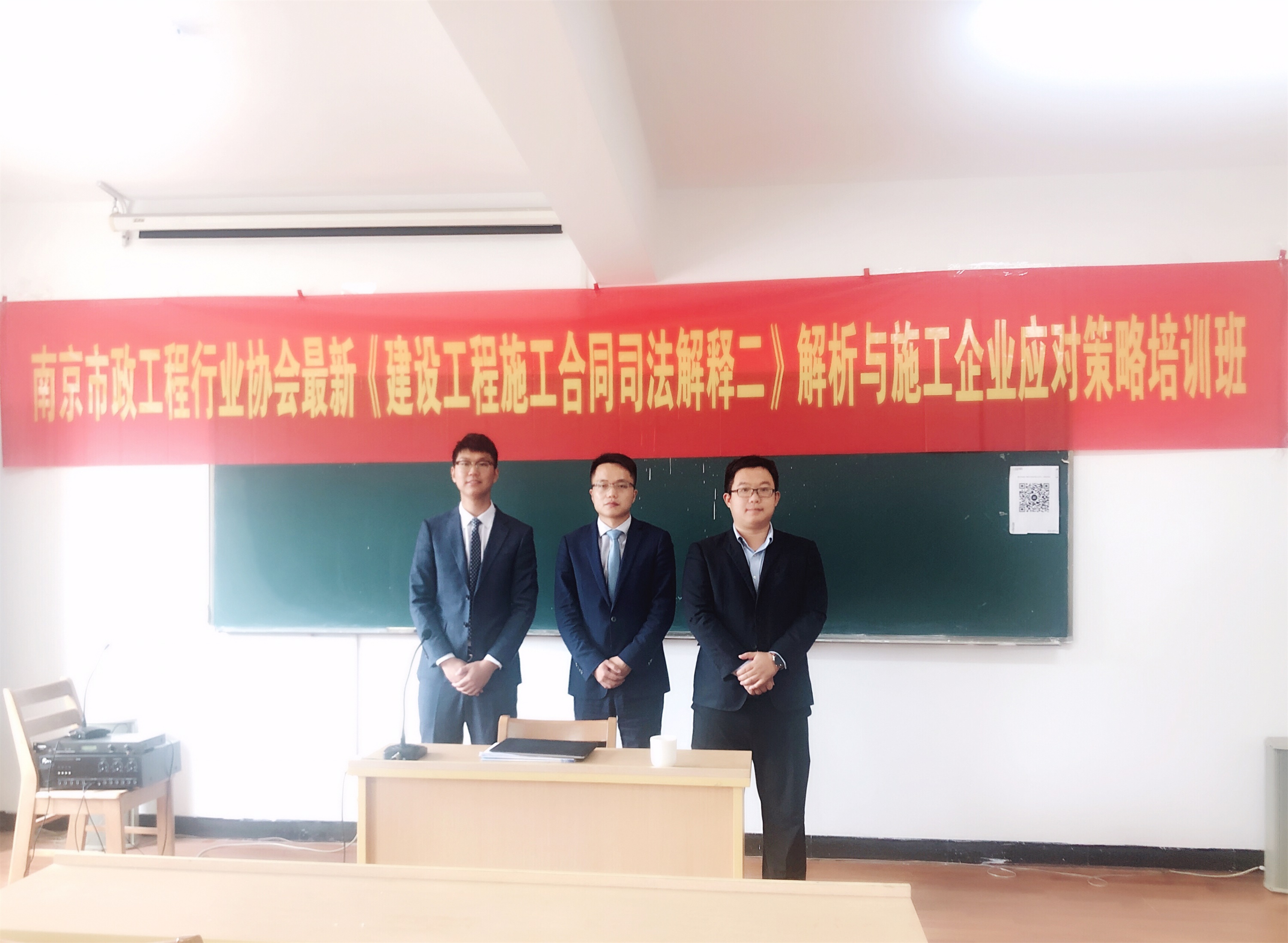 2019年4月29日至30日,江蘇法德東恒律師事務(wù)所建設(shè)工程法律服務(wù)中心石榮王、滕兆林、朱泊文三位律師應(yīng)南京市政工程行業(yè)協(xié)會(huì)邀請(qǐng),在市政工程協(xié)會(huì)的培訓(xùn)教室為協(xié)會(huì)會(huì)員單位進(jìn)行了主題為“《建設(shè)工程施工合同司法解釋二》解析與施工企業(yè)應(yīng)對(duì)策略”的實(shí)務(wù)培訓(xùn)。近四十家施工企業(yè)的分管副總經(jīng)理、法務(wù)總監(jiān)、經(jīng)營管理人員參加了此次培訓(xùn)。
