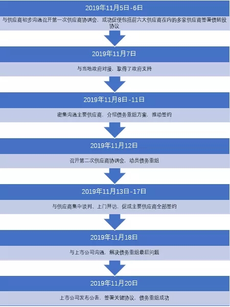 汪律師團隊于2019年11月4日正式進場,在全面了解目標(biāo)公司資產(chǎn)負債的情況下,迅速制定債轉(zhuǎn)股、債務(wù)打折等債務(wù)重組方案,并在兩周左右的時間內(nèi)便成功完成債務(wù)重組目標(biāo),化解了目標(biāo)公司的債務(wù)危機。主要工作步驟: