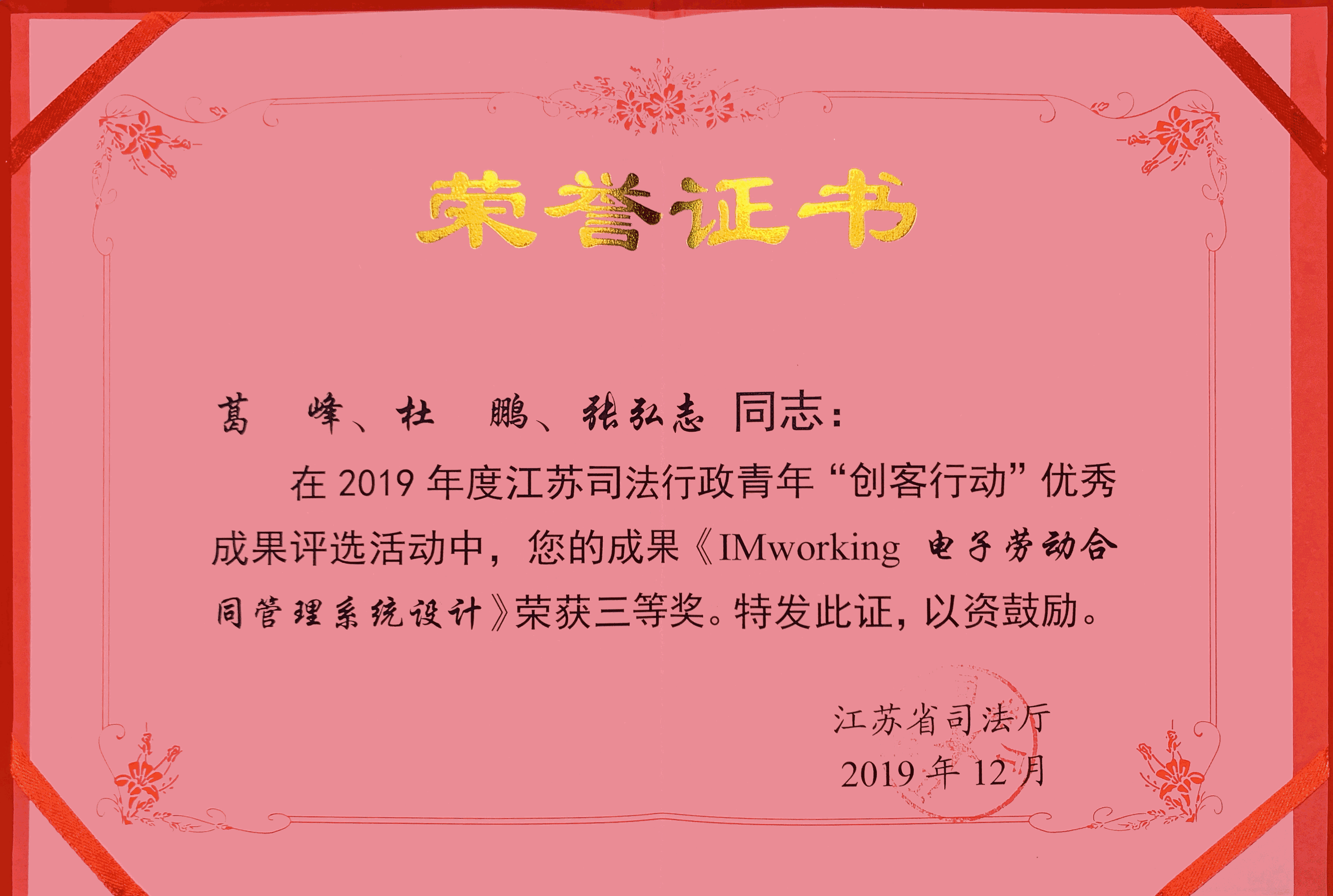 近日,江蘇省司法廳下發(fā)《關(guān)于表揚(yáng)第四屆司法行政青年“創(chuàng)客行動”優(yōu)秀成果的通知》,江蘇法德東恒律師事務(wù)所葛峰、杜鵬、張弘志律師設(shè)計的《IMworking 電子勞動合同管理系統(tǒng)設(shè)計》榮獲三等獎。