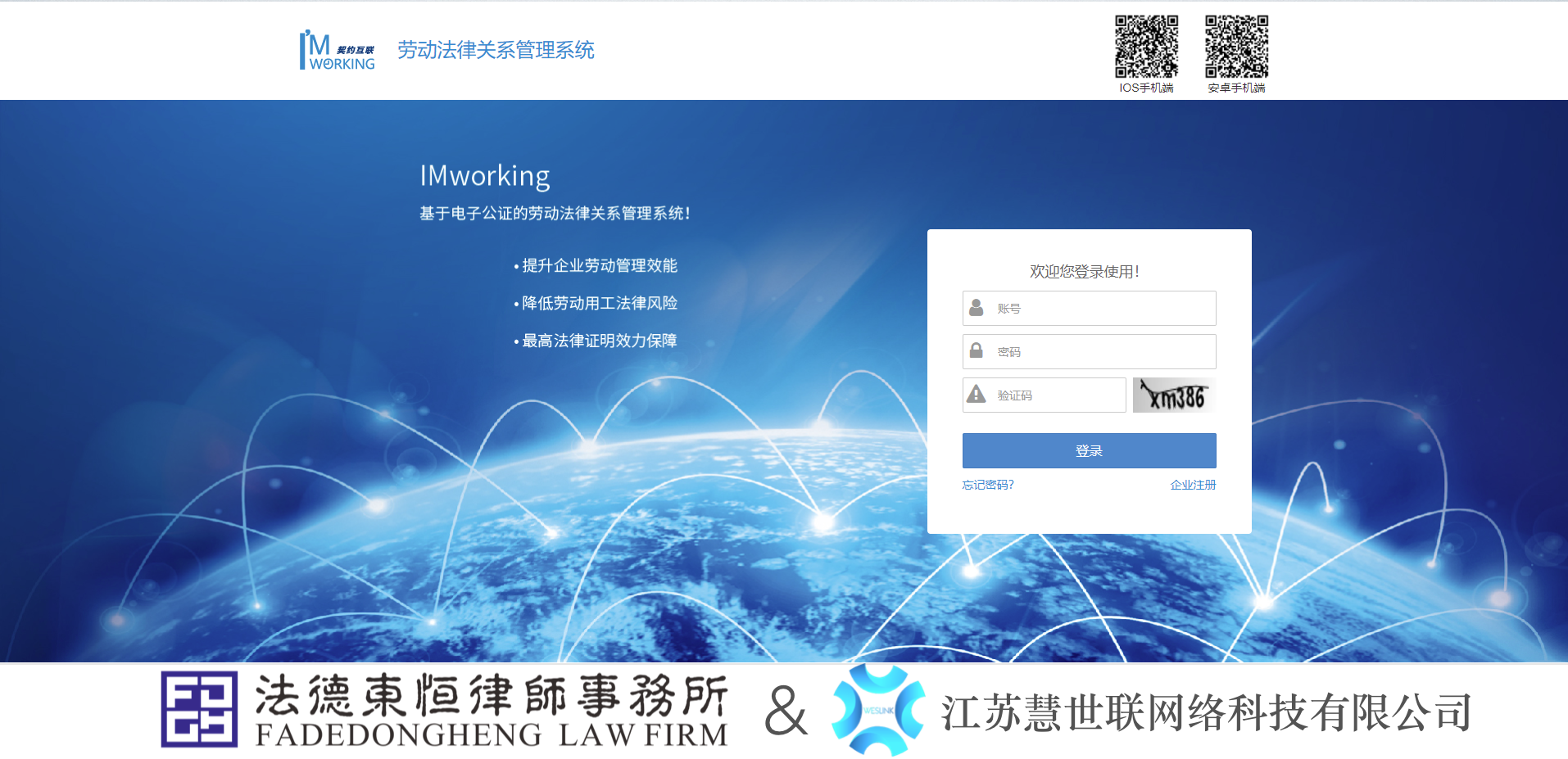IMworking是由江蘇法德東恒律師事務(wù)所的專業(yè)勞動法律風(fēng)險控制服務(wù)、江蘇慧世聯(lián)網(wǎng)絡(luò)科技有限公司的契約互聯(lián)電子公證服務(wù),強(qiáng)強(qiáng)結(jié)合,孕育而出的勞動用工法律風(fēng)險控制系統(tǒng)。