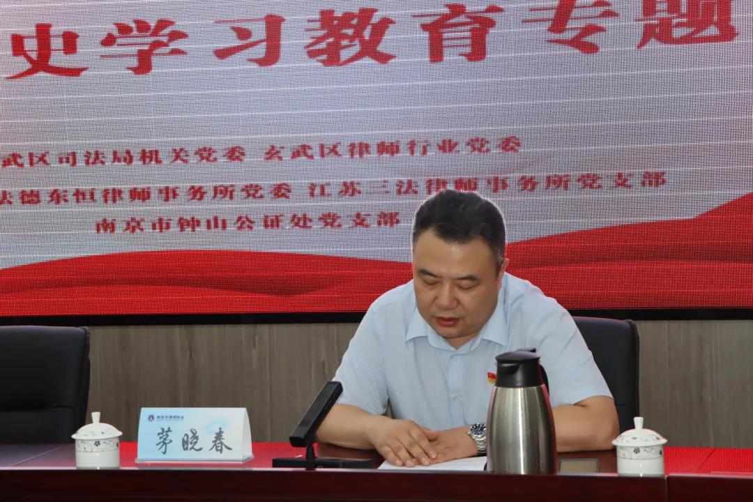 6月2日下午,為深入推進(jìn)黨史學(xué)習(xí)教育,重溫黨的奮斗歷程,玄武區(qū)司法局機(jī)關(guān)工委、律師行業(yè)黨委主辦,江蘇法德東恒律師事務(wù)所黨委、江蘇三法律師事務(wù)所黨支部、南京市鐘山公證處黨支部承辦的“追尋紅色足跡、感悟奮斗歷程”黨史學(xué)習(xí)教育專題黨課活動,在市律師協(xié)會大報告廳舉行。