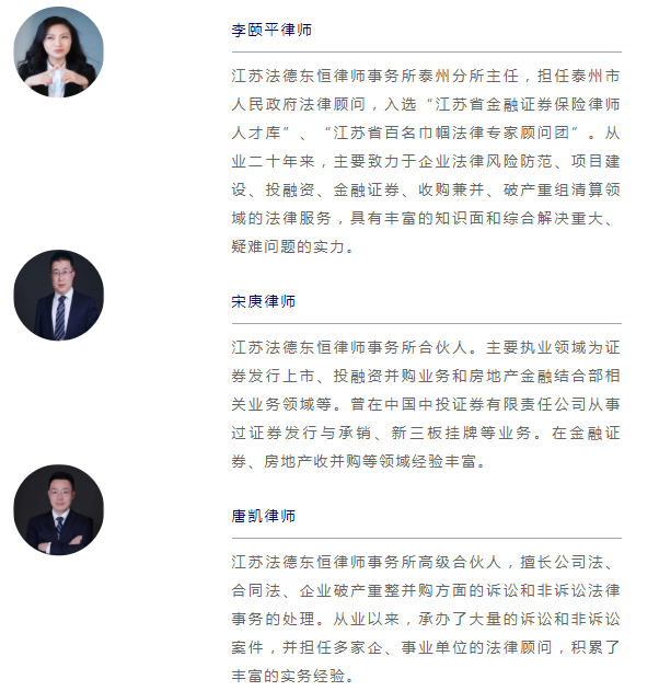 法德東恒總所與泰州分所協(xié)同承辦了姜堰經開集團的本次非公開發(fā)行業(yè)務,項目組由李頤平律師團隊、宋庚律師團隊及唐凱律師團隊組成,項目組與各方密切配合,獲得一致好評,為實現本次項目的全面、高效展現了極高的業(yè)務水平及專業(yè)能力。
