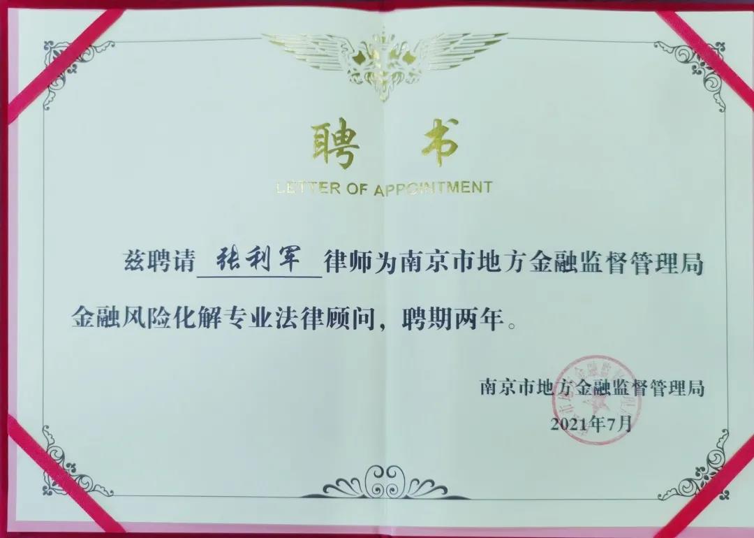 法德東恒資訊 | 張利軍律師受聘為南京市地方金融監(jiān)督管理局金融風險化解專業(yè)法律顧問