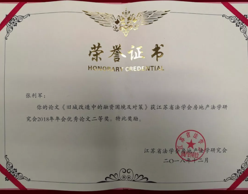 喜訊|張利軍主任榮獲省法學(xué)會(huì)房地產(chǎn)法學(xué)研究會(huì)優(yōu)秀論文二等獎(jiǎng)
